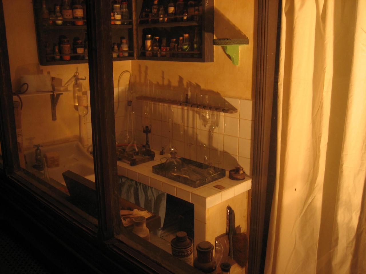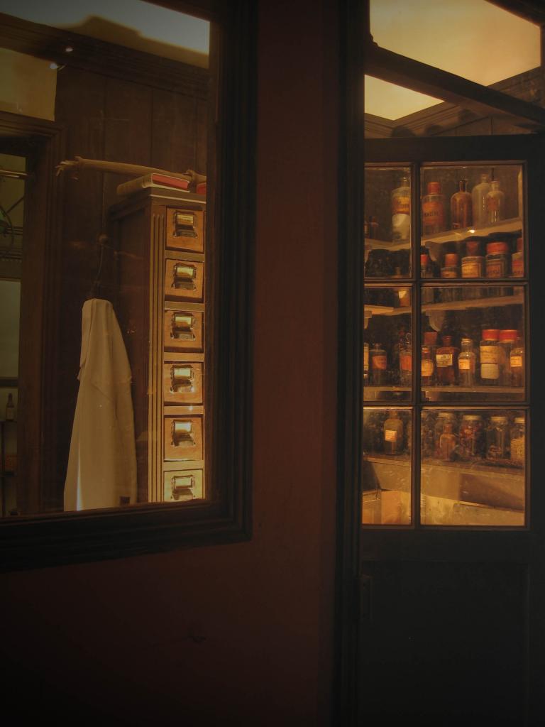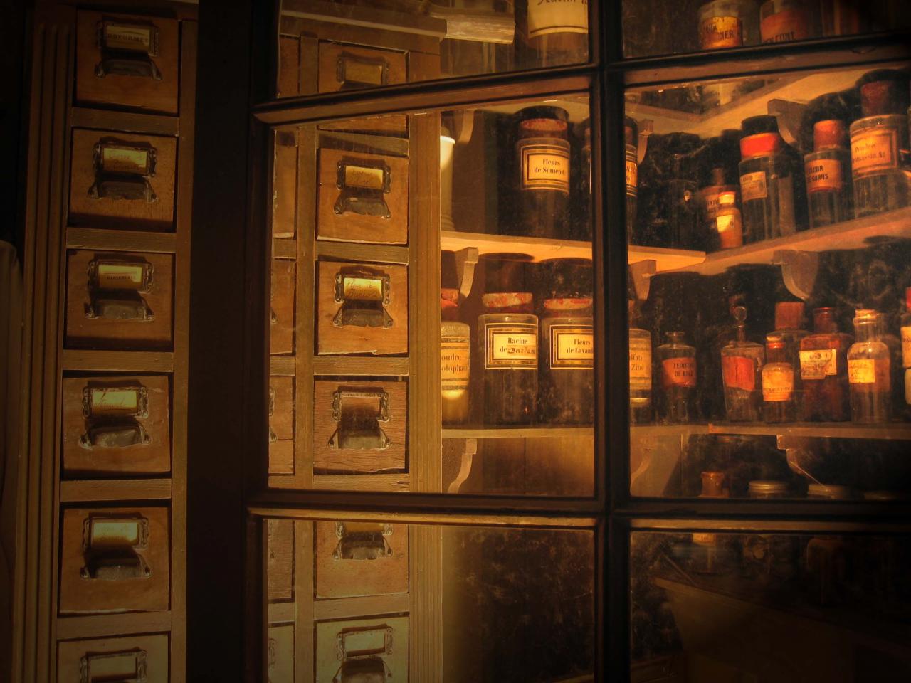 Conception et réalisation d' un décor d'arrière-boutique de pharmacie 1900.